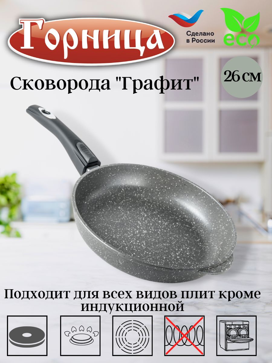 Литая алюминиевая сковорода с антипригарным покрытием – оригинальная посуда ТМ Горница, которая подходит для газовых, электрических и стеклокерамических плит. «Графит». Коллекция «мраморной посуды» с улучшенным четырёхслойным антипригарным покрытием. Дополнительный слой с мраморным эффектом увеличивает износостойкость и создаёт оттенок серого мрамора. Сковорода литая изготовлена из пищевого алюминия без канцерогенных веществ. Антипригарная сковорода имеет толстые стенки и утолщенное дно, что способствует равномерному распределению тепла и создает благоприятные условия для качественного процесса готовки.