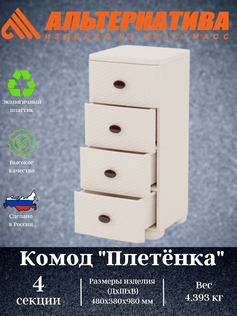 Изделие способно гармонично вписаться в интерьер любой комнаты.Комод произведен из высококачественного и безопасного полипропилена. Комод имеет четыре выдвижных ящика большой вместимости, в которых будет очень удобно хранить личные вещи и другие принадлежности.