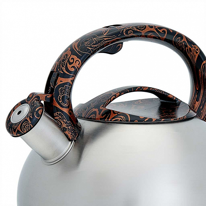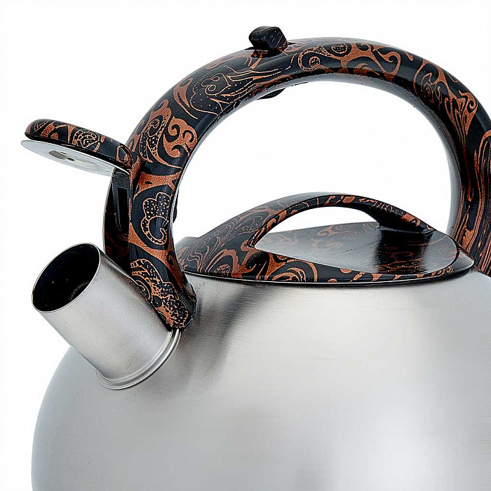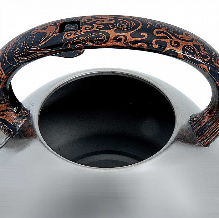 Чайник из нержавеющей стали со свистком. Матовая сатиновая полировка. Нейлоновая ручка с кнопкой открывания носика. Цвет ручки и крышки: черный мрамор. Пригоден для использования на всех типах кухонных плит, включая индукционные