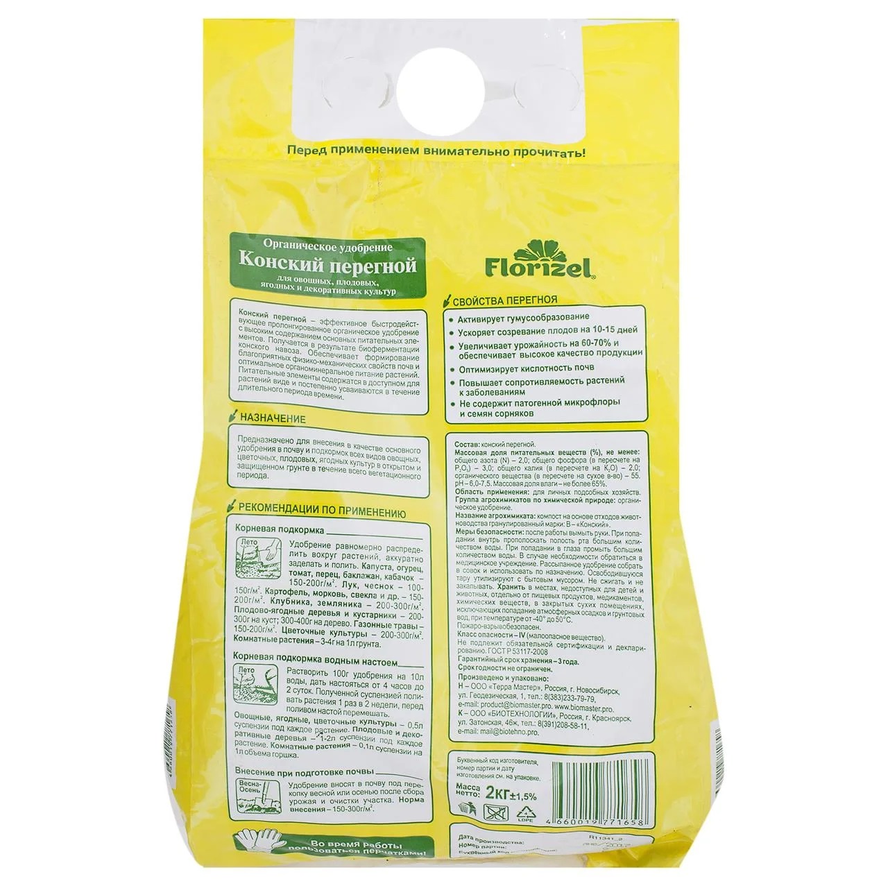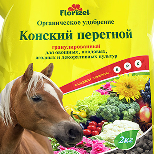 "Удобрение Florizel «Конский перегной гранулированный» предназначено для выращивания овощей, ягод, плодовых деревьев, комнатных растений и газонов. Обогащает почву, подходит для открытого грунта и теплиц. Обеспечивает оптимальное питание растений органическими и минеральными элементами в период роста, развития и плодоношения.