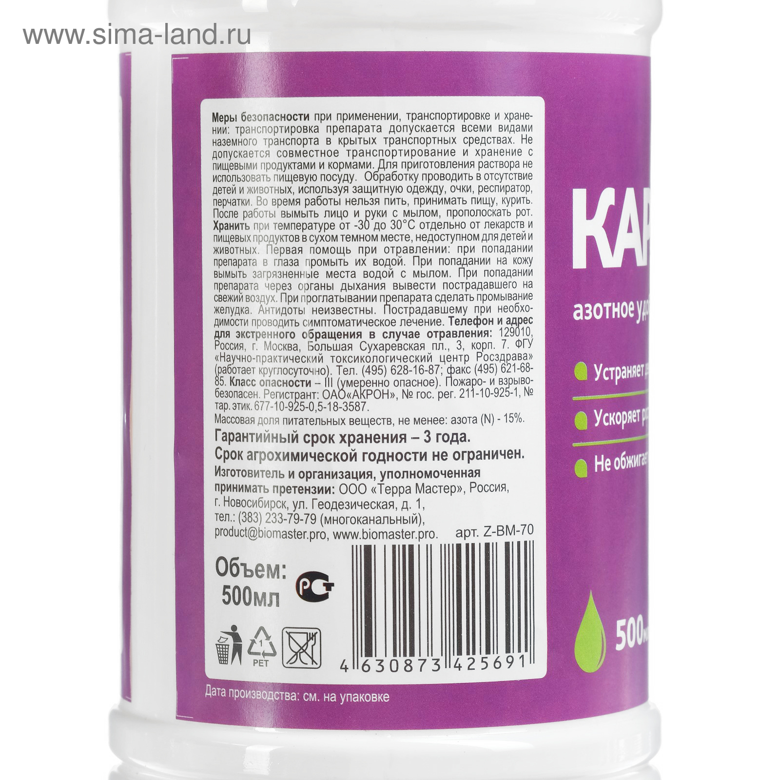 Массовая доля питательных веществ, не менее: азот (N) - 15%.