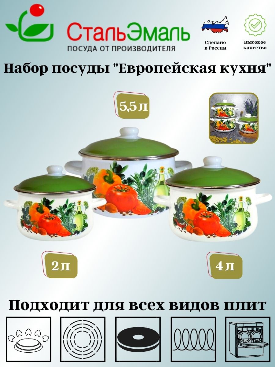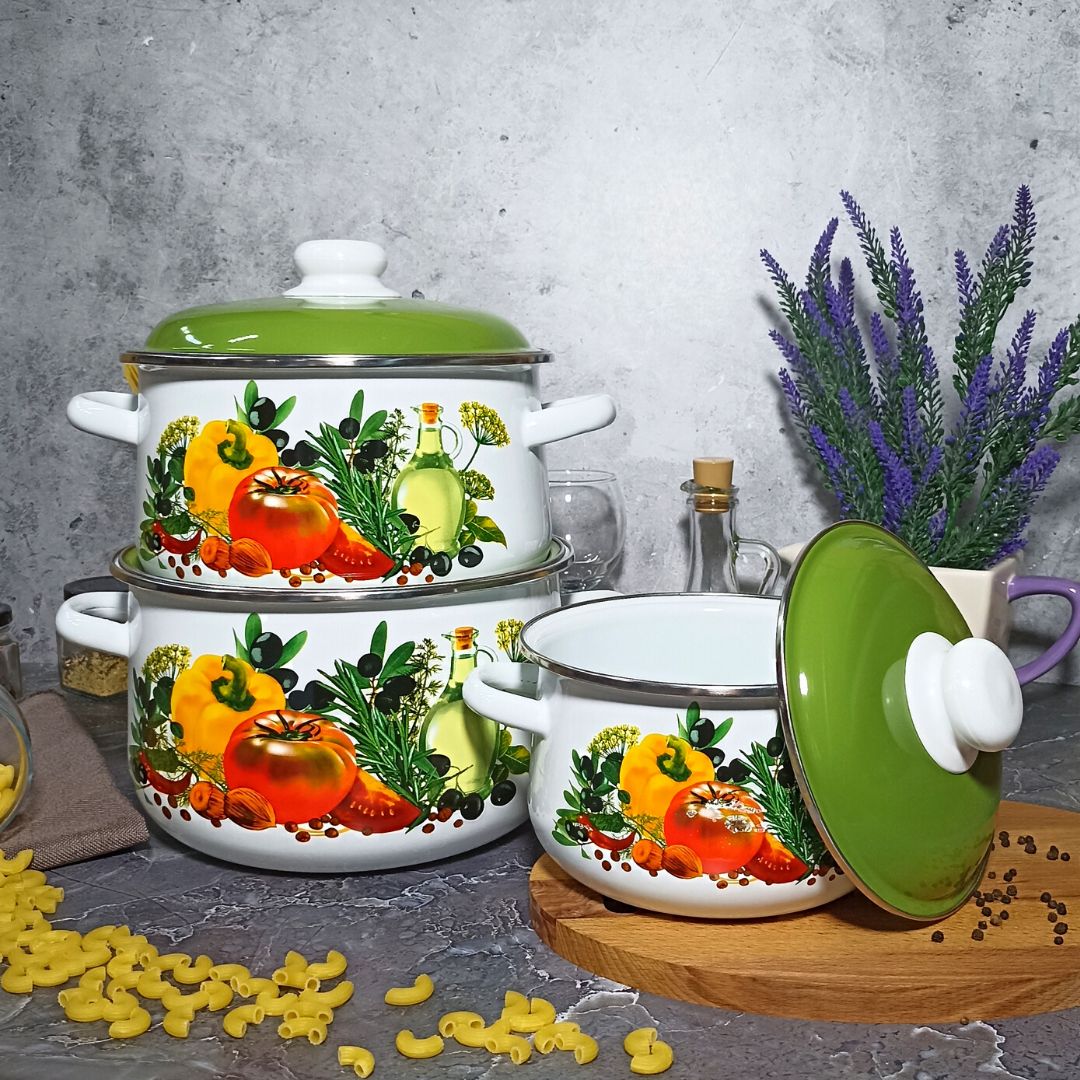 Набор из трех кастрюль конической формы с высоким корпусом. Посуда изготовлена по ГОСТ 24788 из высококачественного стального проката, покрытого двумя слоями жаропрочной эмали. Борта корпусов и крышек кастрюль защищены нержавеющим ободком.Подходит для всех видов плит, в том числе индукционных.Можно мыть в посудомоечной машине.Может использоваться для длительного хранения пищевых продуктов.
