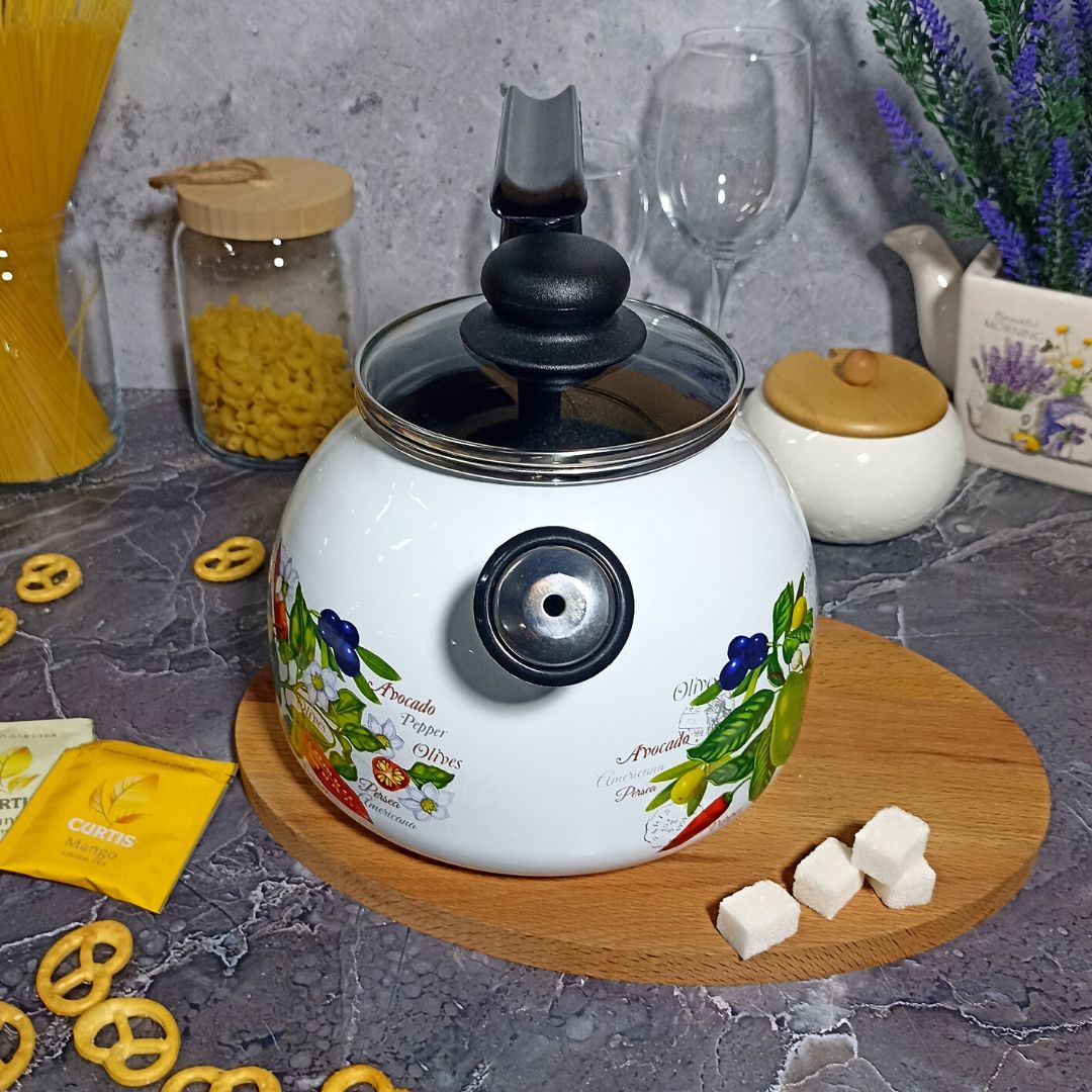 Чайник сферической формы сочетает в себе исключительные качества стальной эмалированной посуды и дополнен удобной крышкой из жаропрочного стекла с пароотводом, ручкой из термостойкой пластмассы, свистком.Для регулировки посадки стеклянной крышки в горловине сферического чайника на нержавеющем ободке крышки имеются «фиксаторы», при отгибании наружу которых крышка более плотно садится в горловину. Свисток в конструкции сферических чайников является «звуковым» элементом, сигнализирующим о закипании жидкости. При наливании жидкости из чайника свисток должен быть снят.