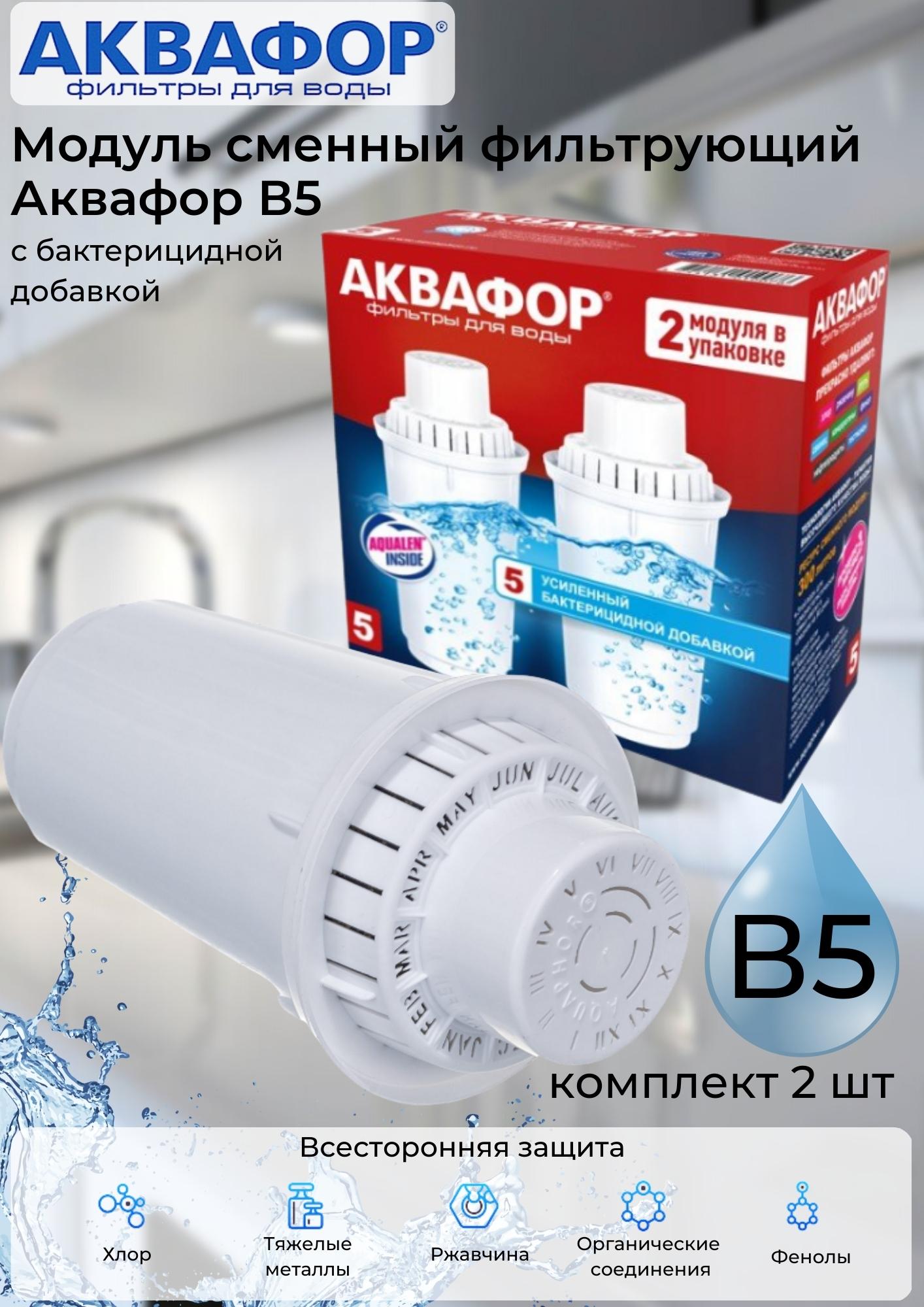 Комплект сменных фильтрующих модулей Аквафор В5 (2 шт.) очистит воду от самых распространенных примесей, включая хлор, органические соединения (в т. ч. фенолы), тяжелые металлы, ржавчину, остатки лекарственных средств.
