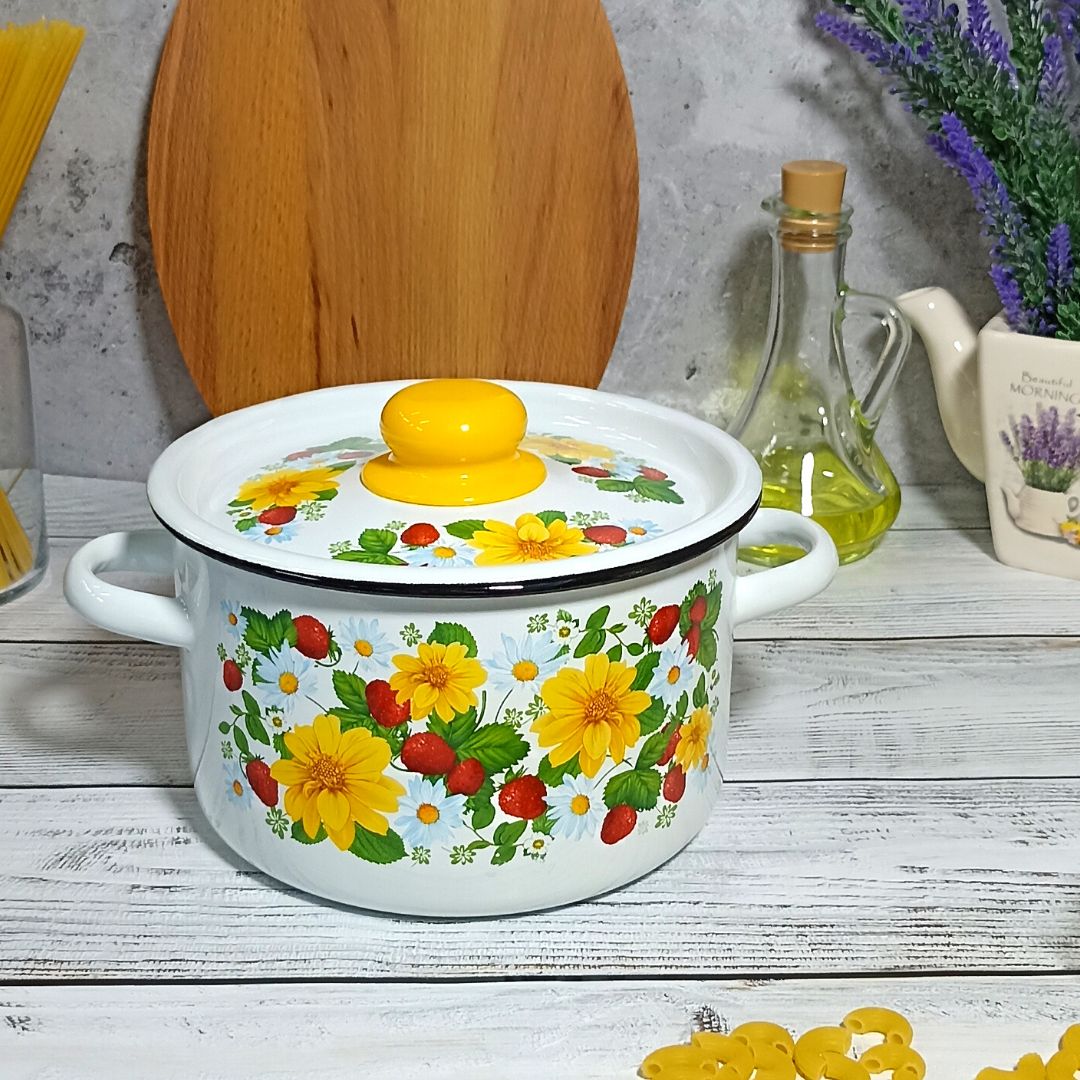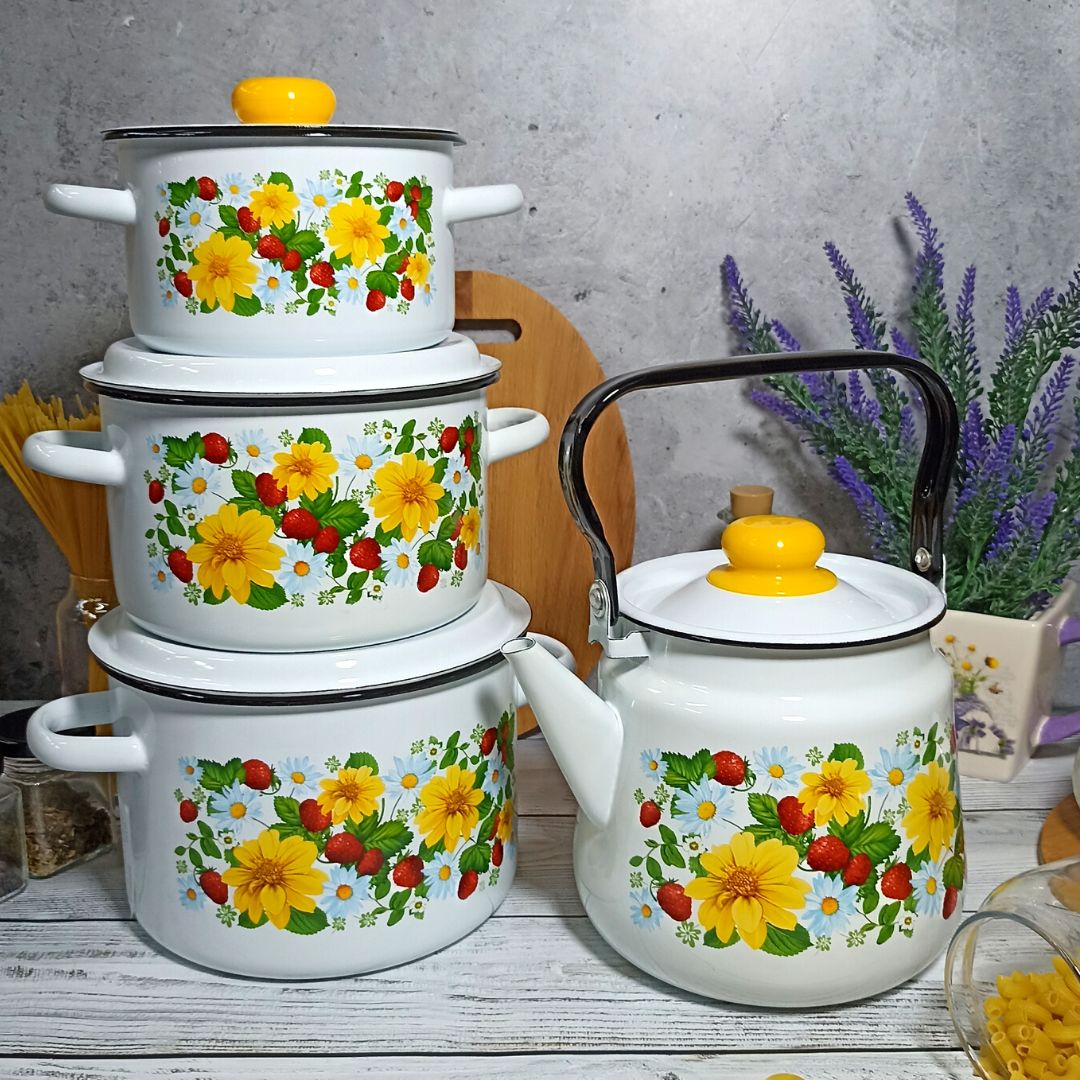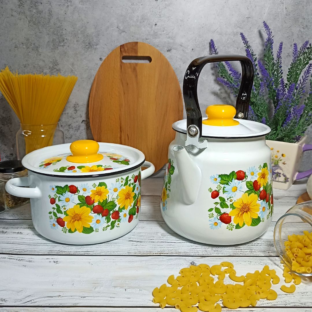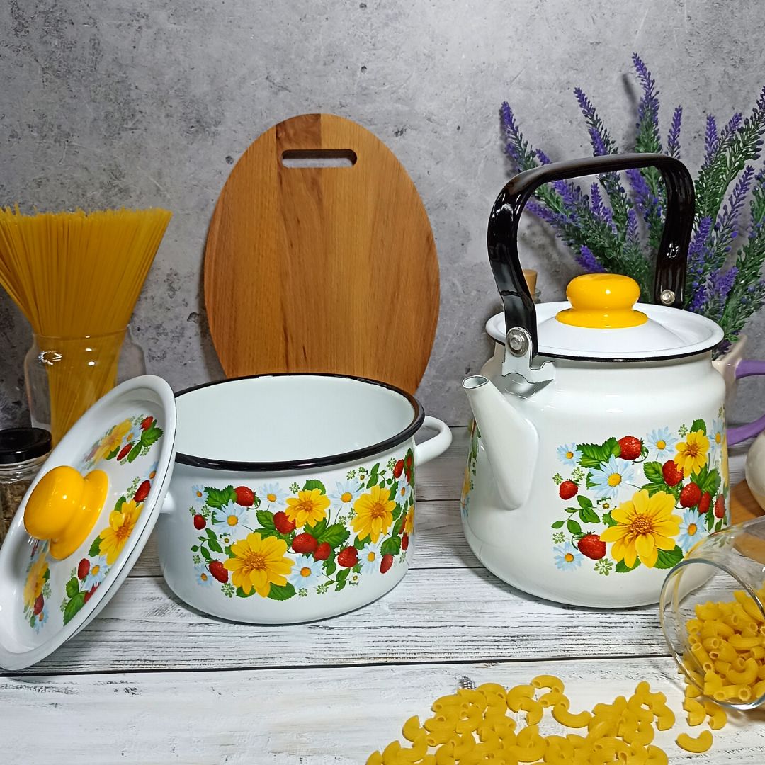 Набор посуды СтальЭмаль земляника 1с142 выполнен с применением передовых технологий производства из высококлассных материалов. Посуда полностью соответствует самым строгим мировым стандартам в области безопасности и экологии. Все предметы выполнены из нержавеющей стали и покрыты декорированной эмалью.