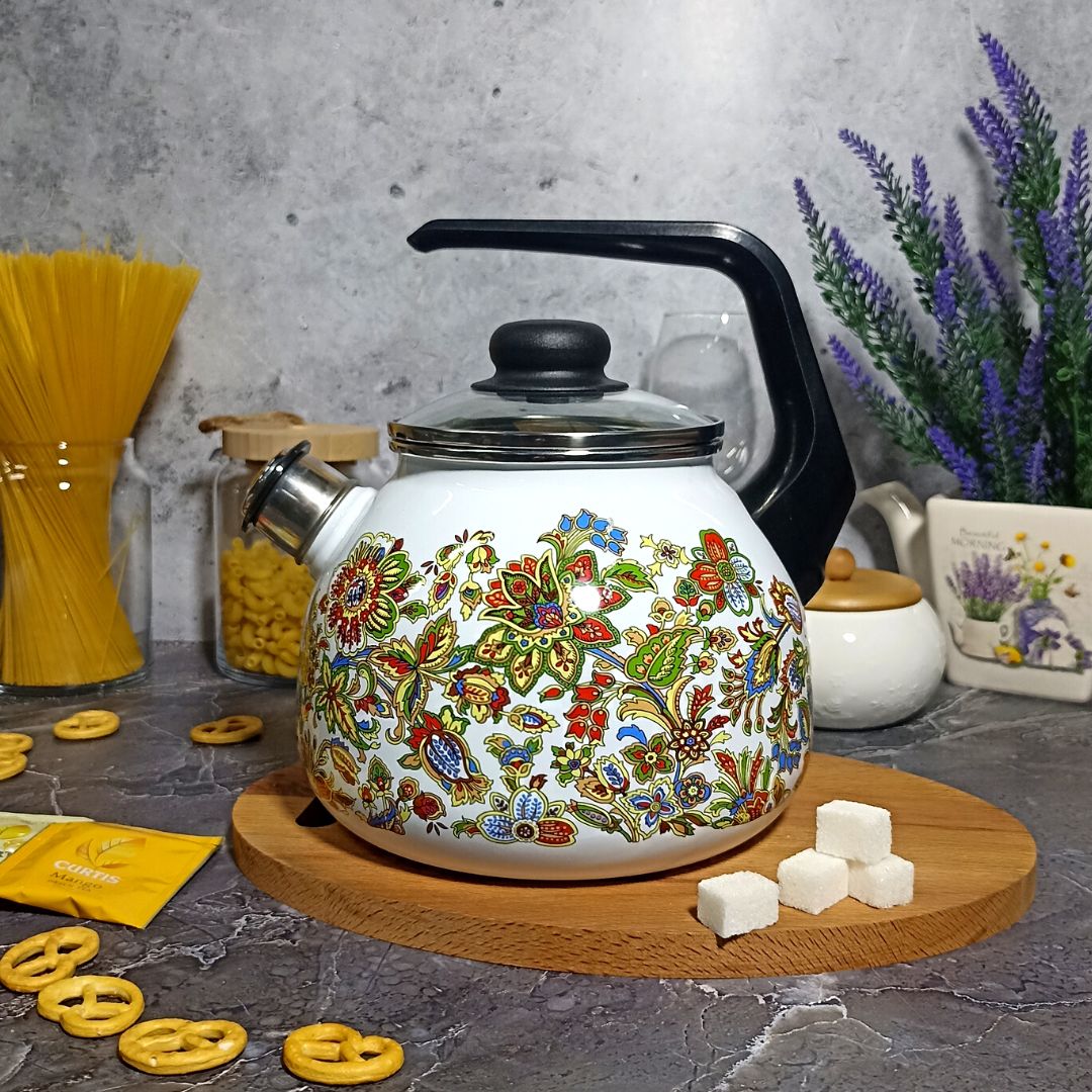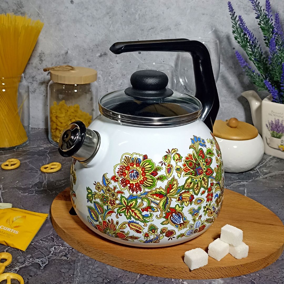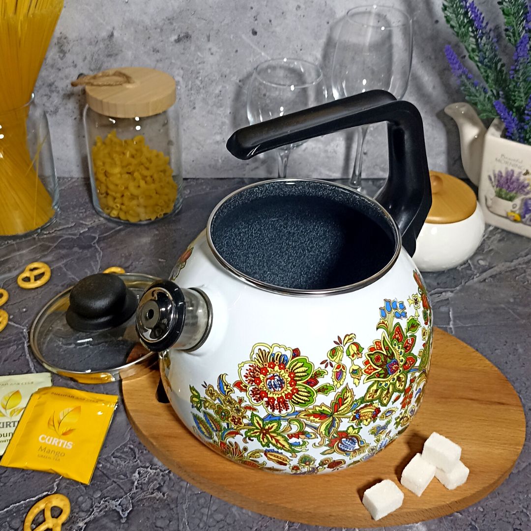 Стальной эмалированный чайник сферической формы для кипячения воды. Комплектуется крышкой из жаропрочного стекла с пароотводом, свистком, ручкой из термостойкой пластмассы, борт защищен нержавеющим ободком. Увеличенная толщина металлического корпуса изделия (1 мм) обеспечивает более равномерное распределение и сохранение тепла, прочный металлический корпус не деформируется в процессе эксплуатации.Всю эмалированную посуду можно мыть в посудомоечной машине, но сушку изделий с нержавеющими ободками рекомендуется выполнять дном вниз.