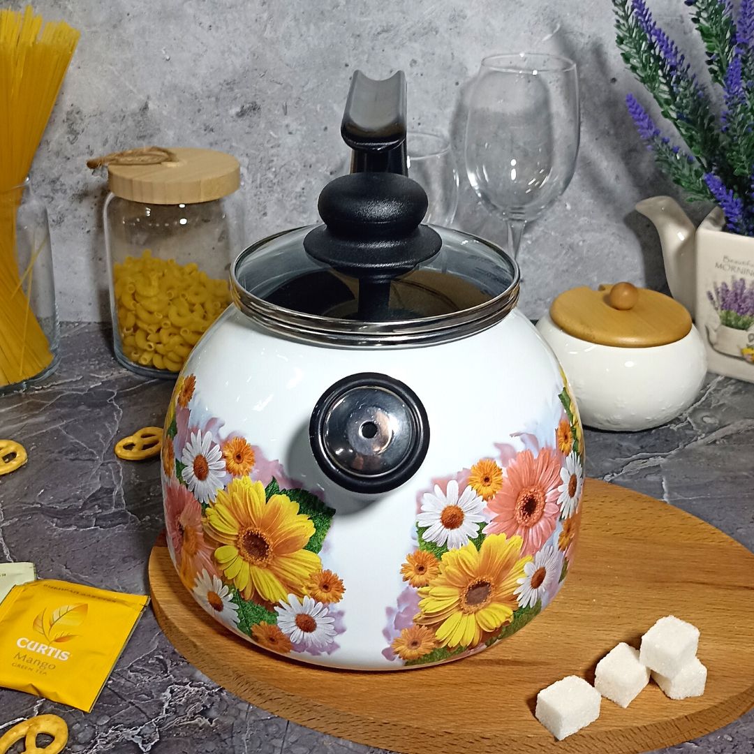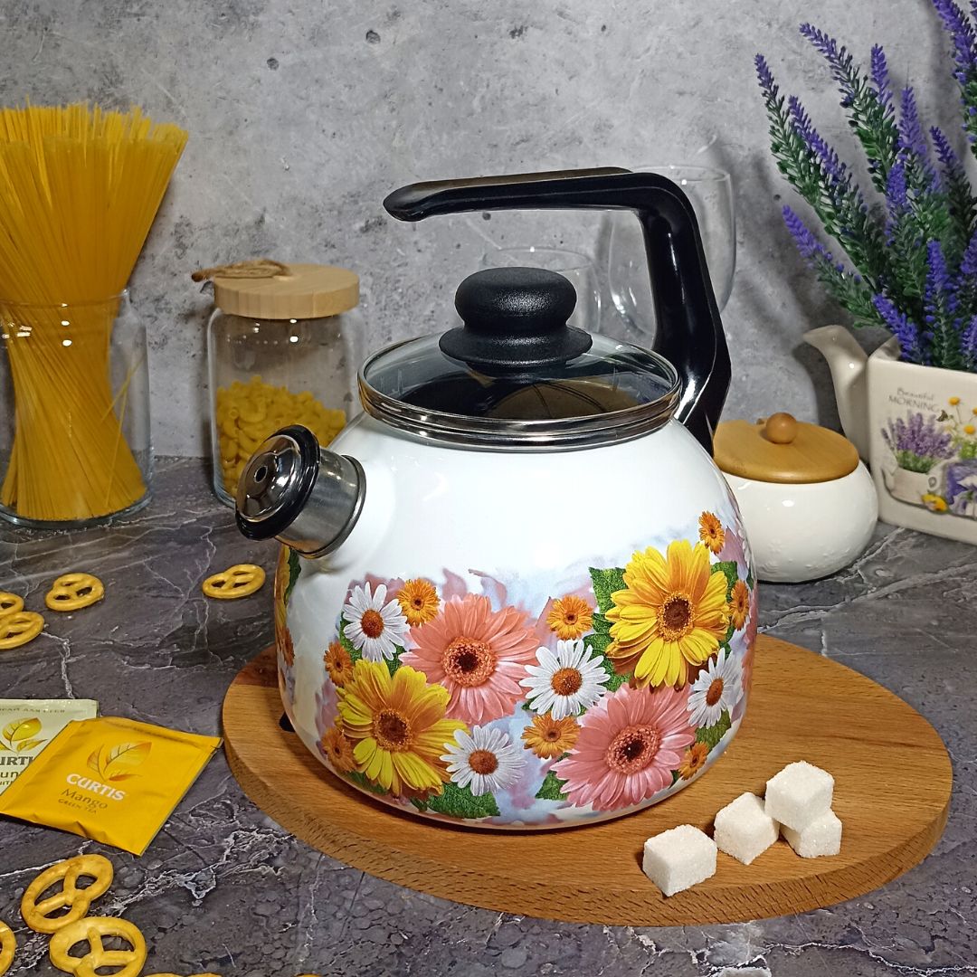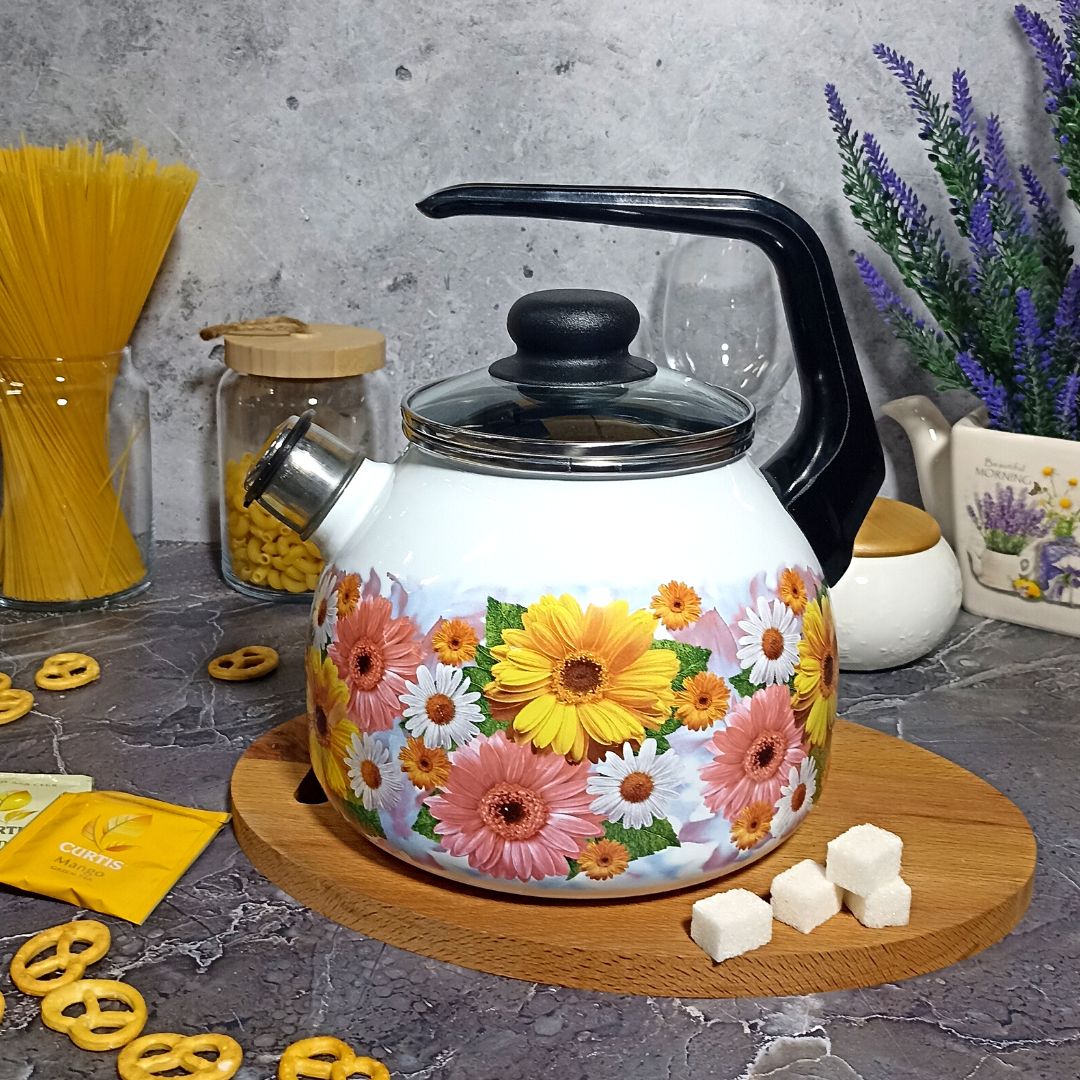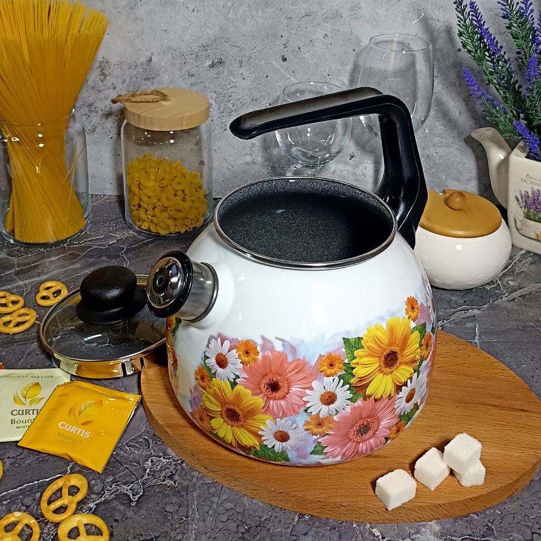 Стальной эмалированный чайник сферической формы для кипячения воды. Комплектуется крышкой из жаропрочного стекла с пароотводом, свистком, ручкой из термостойкой пластмассы, борт защищен нержавеющим ободком. Увеличенная толщина металлического корпуса изделия (1 мм) обеспечивает более равномерное распределение и сохранение тепла, прочный металлический корпус не деформируется в процессе эксплуатации.Всю эмалированную посуду можно мыть в посудомоечной машине, но сушку изделий с нержавеющими ободками рекомендуется выполнять дном вниз.