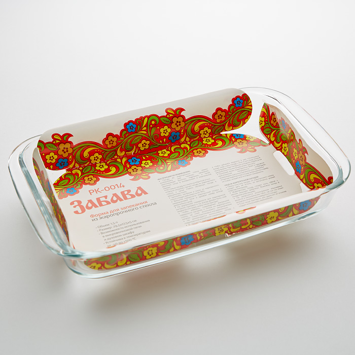 Прямоугольная форма для запекания, 1,5л, забава РК-0014, 29.5*17.5*5см. Форма для запекания из высококачественного термостойкого стекла. Форма имеет безупречно ровное дно и две эргономичные ручки. Прозрачность формы способствует удобству контроля за процессом использования предмета посуды как в активном режиме, так и в режиме хранения.
