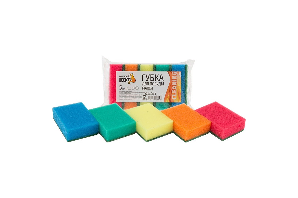 Губка для посуды Рыжий кот Макси 5 шт. 310220 используется для мытья посуды, сантехники и других поверхностей.