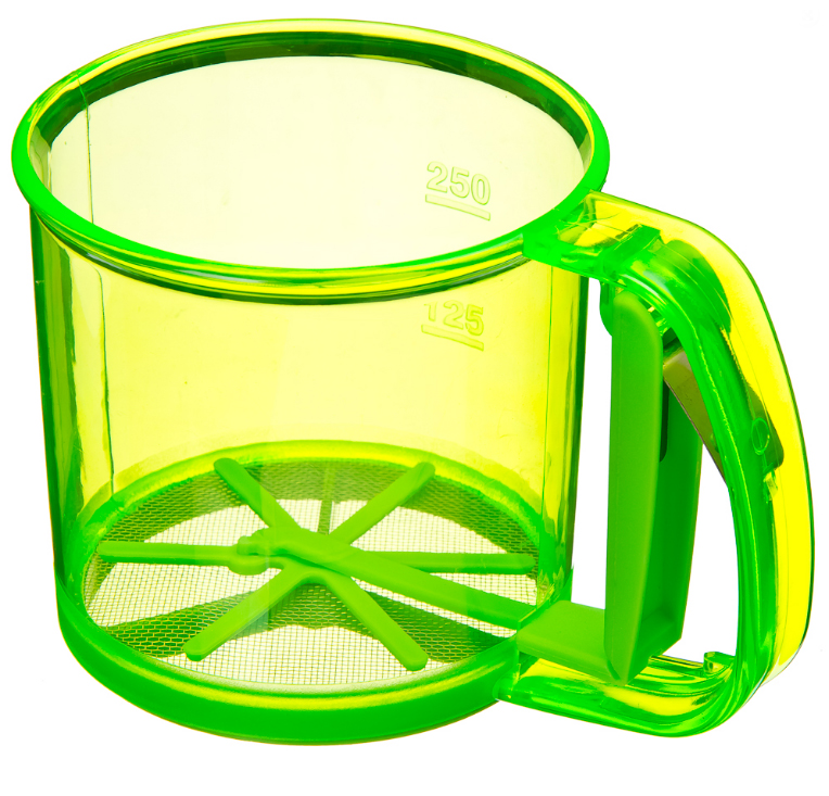 Кружка-сито - ёмкость для просеивания муки, сахарной пудры, манки, какао и других мелких сыпучих продуктов. Кружка состоит из корпуса с двойным ситовым дном и ручки, внутри которой находится пружина. Благодаря ручке-рычагу вы с легкостью просеете муку, без труда потом очистите изделие от остатков.