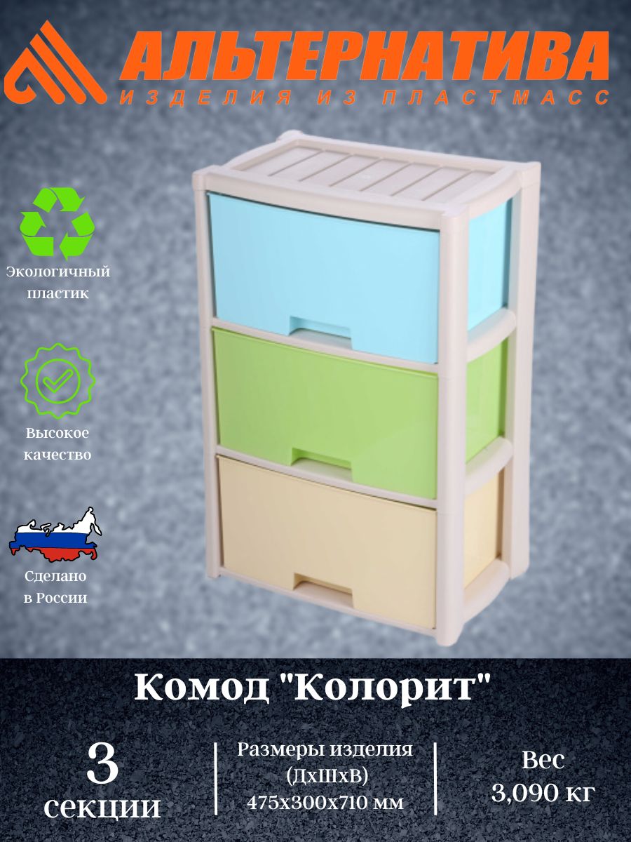 омод 3-х секционный Альтернатива М7837 "Колорит" цветной произведен из высококачественного и безопасного полипропилена. Особую прочность комоду придает его цельная конструкция перегородок. Комод имеет выдвижные и достаточно вместительные ящики. На крышке и перегородках предусмотрены ограничители, благодаря которым ящик не будет вылетать при открывании. Такой комод станет отличным решением для организации хранения практически в любой комнате вашей квартиры или дома.