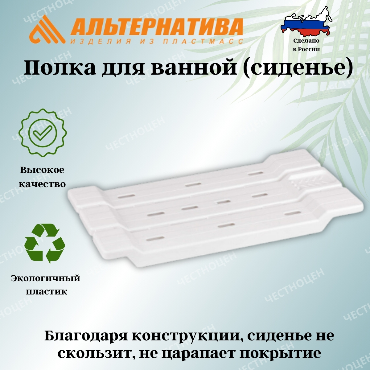 Полка для ванной (сиденье) изготовлена и прочного пластика. Сиденье дополнит функционал ванной и станет удобным аксессуаром при купании для людей, кому в силу своего возраста и здоровья сложно принимать водные процедуры стоя. Сиденье подходит к стандартной ванне. Благодаря конструкции, сиденье не скользит, не царапает покрытие. На одном из краев полки предусмотрено место для мыла. Допустимая нагрузка до 100 кг. Такую полку можно использовать как подставку для таза при купании детей.