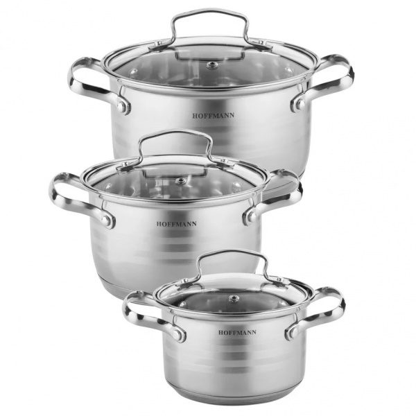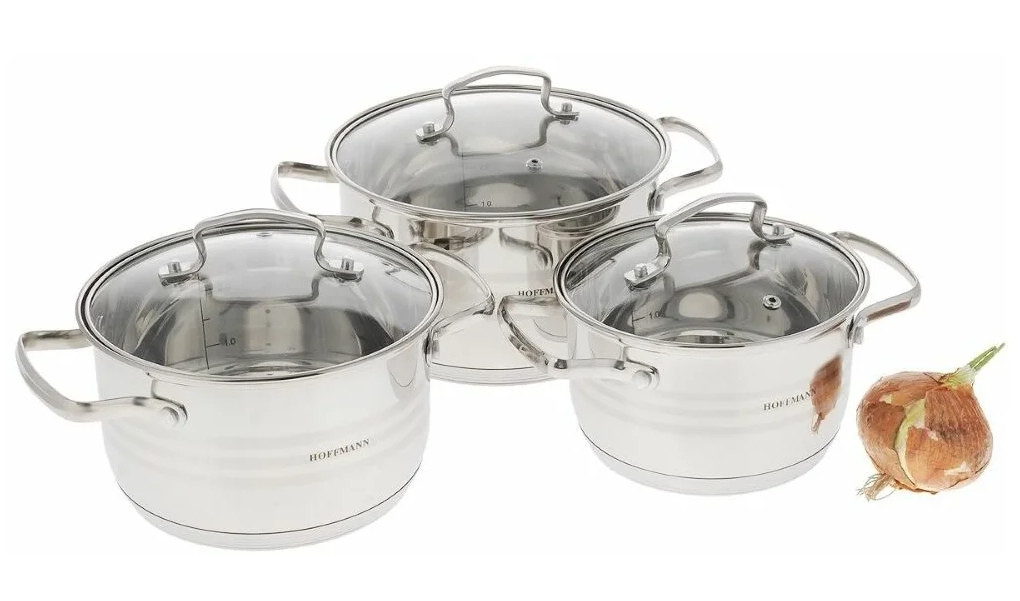 Набор посуды 6 предметов, нержавеющая сталь 0,5 мм: кастрюли 3 шт. – 1,3 л. (14 см), 2,1 л. (16 см), 3,1 л. (18 см).; крышка из закаленного стекла с отверстием для паровыпуска, 5-ти слойное термоаккумулирующее капсулированное дно (технология сендвич, алюминиевая пластина), индукция