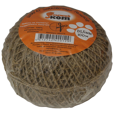 Упаковочный льняной шпагат Рыжий кот клубок D1,5мм 1000тэкс 100м 082274 используется для связки и упаковки различных материалов, крепления растений к опоре, а также для декоративных и дизайнерских целей. Подходит для копчения рыбы, сыров и колбасных изделий. Выполнен из льна, поэтому безопасен для пищевых продуктов. Сохраняет прочность в течение длительного времени, за счет чего отличается долговечностью.