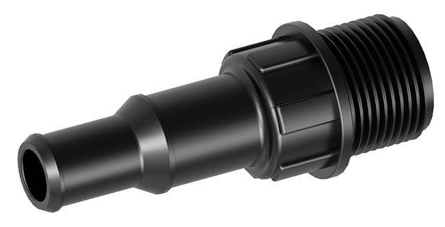 Переходник для шлангов, предназначенный для применения в системах полива на садовых участках. Предназначен для перехода с поливочного шланга на запорную арматуру или фитинги для труб, выполненные из других материалов.